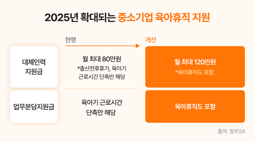 육아휴직으로 인한 기업 부담을 줄이기 위해 대체인력 지원금이 월 80만 원에서 120만 원으로 인상됩니다. 중소기업 입장에서는 필요한 인력을 보충하는 데 실질적인 도움을 받을 수 있습니다.