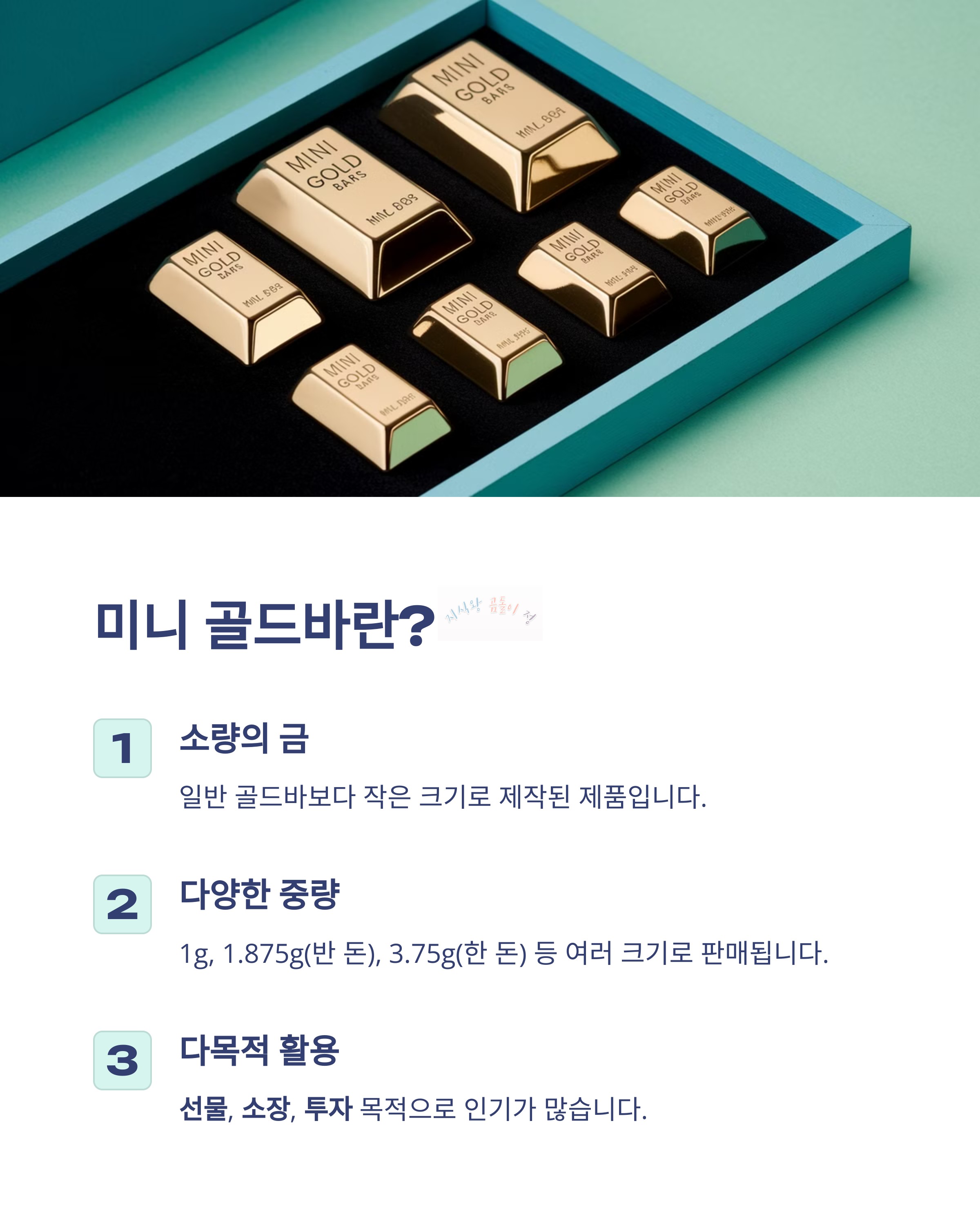 1. 미니 골드바는 투자, 선물, 소장용으로 인기가 높습니다.