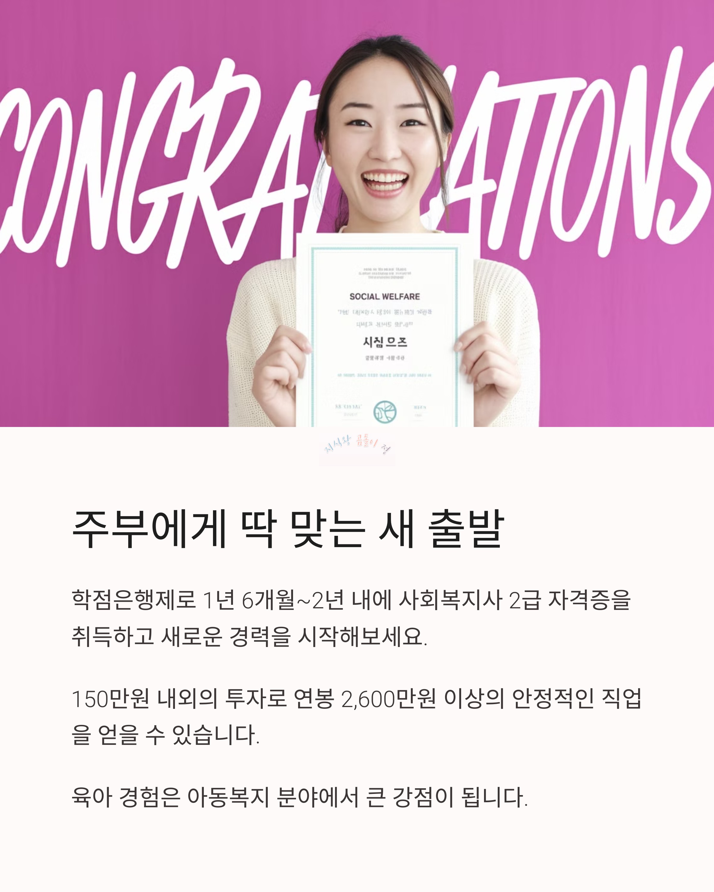 - 학점은행제로 사회복지사 2급 취득 가능 (고졸 기준 1년 6개월~2년 소요)