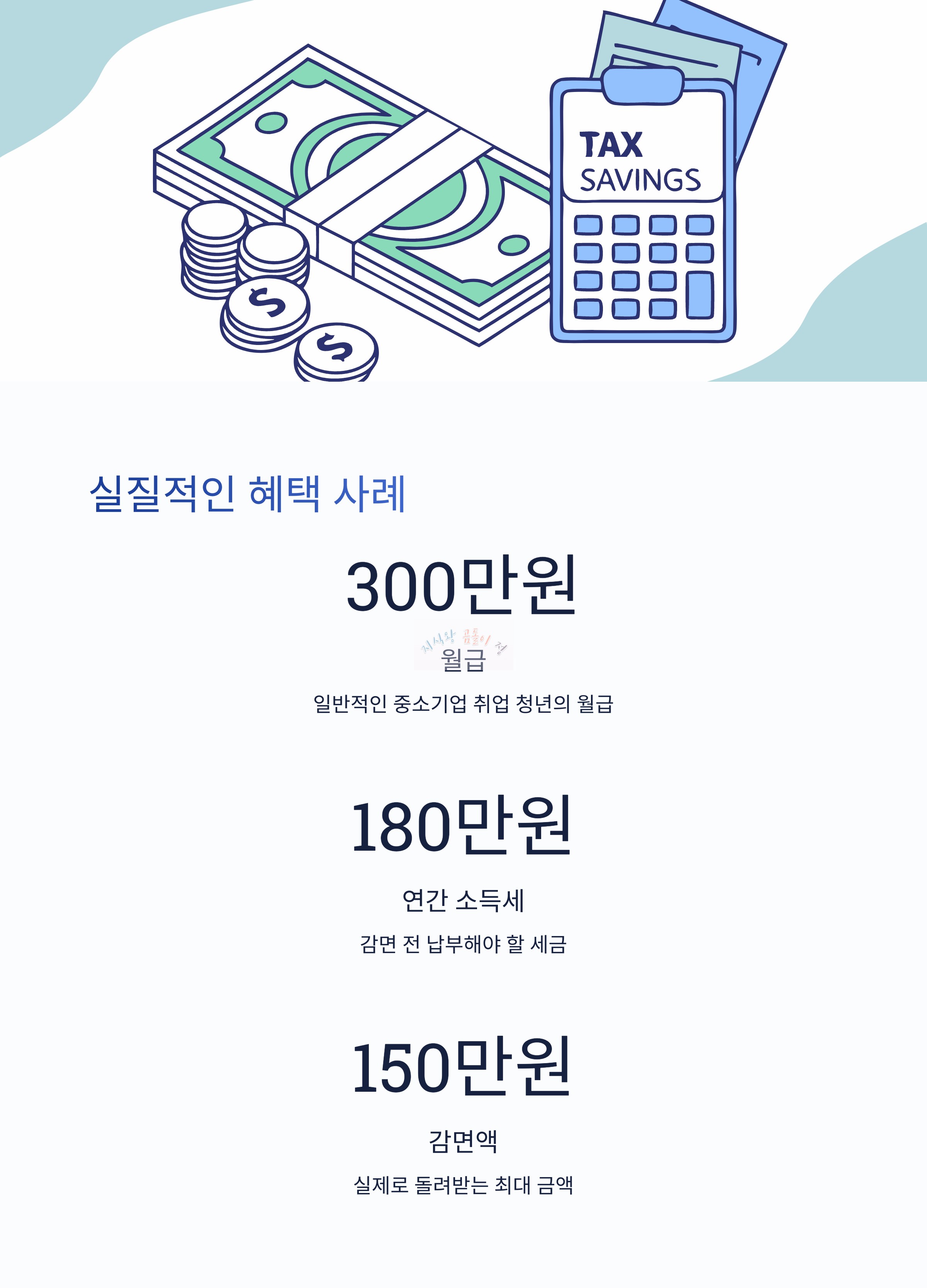 예를 들어, 월급 300만 원인 청년이 연 소득세 180만 원을 내야 한다고 가정하면, 감면 혜택을 통해 최대 150만 원을 돌려받게 됩니다.