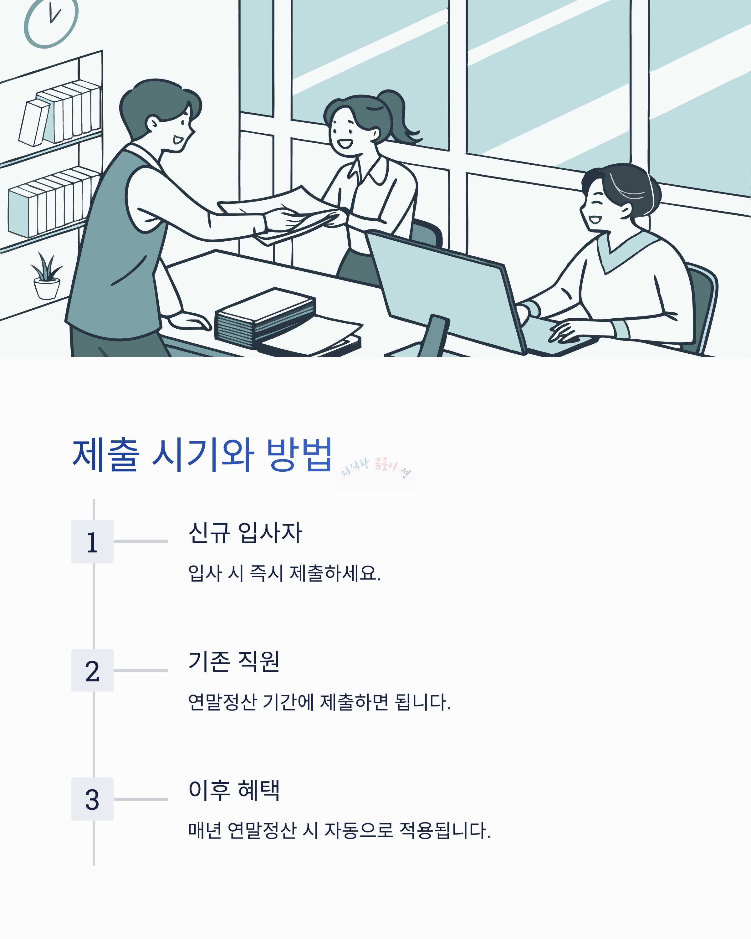 - 기존 입사자 : 해당 연도의 연말정산 기간에 제출