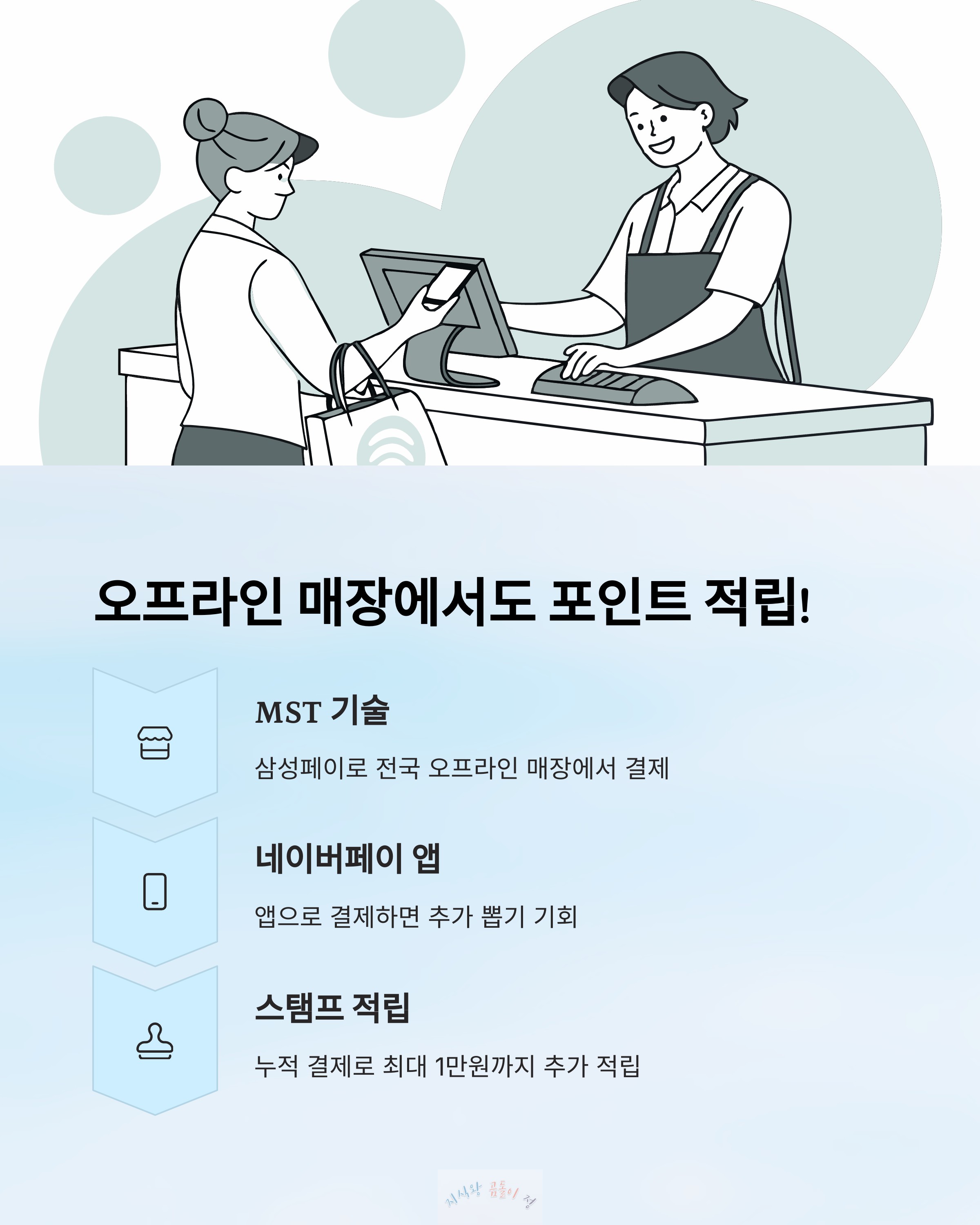 삼성페이 MST 기술 덕분에 전국 오프라인 매장에서 그냥 삼성페이로 결제하면 되고, 포인트는 네이버페이 앱에서 따로 뽑기하면 쌓이는 구조예요.