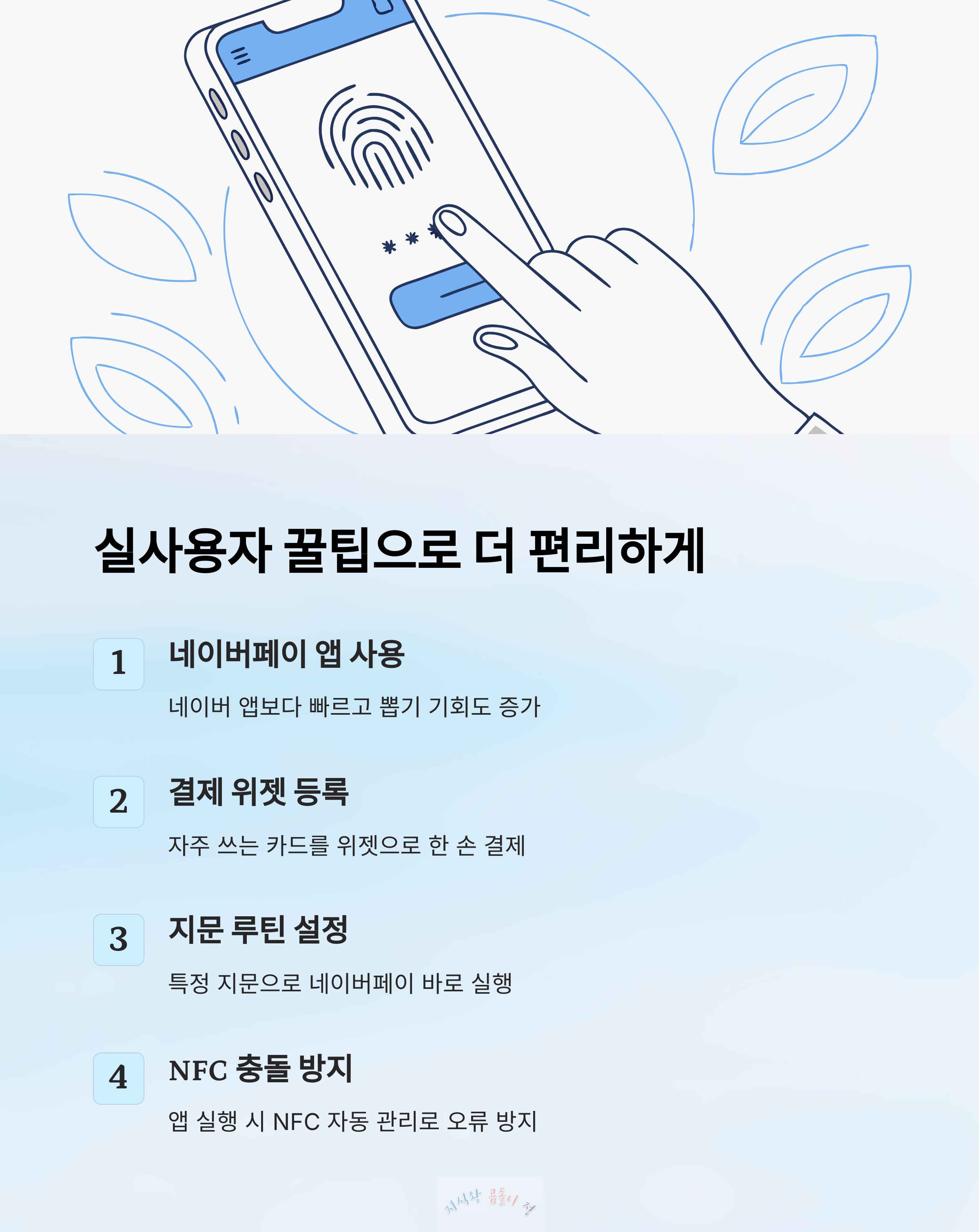 - NFC 충돌 방지 루틴 설정 – 네이버페이 앱 실행 시 NFC 꺼지게, 앱 종료 시 다시 켜지게 설정해두면 결제 오류 방지.