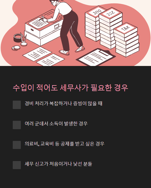 수입이 적더라도 아래에 해당하면 세무사에게 맡기는 게 유리합니다.