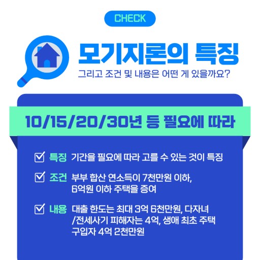 • 장기 대출: 상환 기간이 10년에서 30년에 이르기 때문에 월 상환 부담을 줄일 수 있습니다.