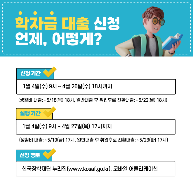 대출 신청 기간을 놓치면 해당 학기 대출이 어려울 수 있습니다. 한국장학재단에서 제공하는 일정을 미리 확인하고 준비하세요.