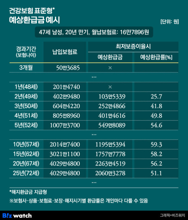 일반적으로 보험은 납입 기간이 끝나갈수록 해지환급금이 급격히 증가합니다. 따라서 몇 년 후 환급금이 얼마나 늘어나는지 확인한 후 결정하세요.